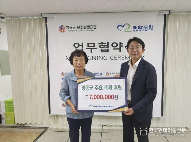 한국현대미술신문 신정은 기자 | 충북 영동양수건설소는 지난 11일 영동문화관광재단과 영동군 주요 축제(포도, 난계국악, 와인) 후원 협약식을 체결했다.
