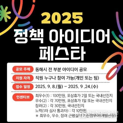 한국현대미술신문 원진 기자 | 동해시는 직원들의 창의적인 아이디어를 발굴해 시정에 즉각 반영함으로써 시민이 체감할 수 있는 정책을 마련하기 위해 '2025 정책 아이디어 페스타'를 9월부터 11월까지 추진한다고 밝혔다.