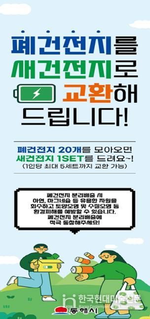 한국현대미술신문 원진 기자 | 동해시가 오는 무릉제 행사기간(9.18.~21.) 동안 시민들의 환경의식 향상과 생활 속 자원순환 문화 확산을 위해 폐건전지 교환행사를 진행한다고 밝혔다.