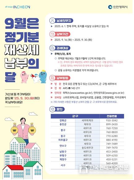 한국현대미술신문 박재남 기자 | 인천광역시는 토지, 주택 소유자에게 9월분 재산세(지역자원시설세 및 지방교육세 포함) 148만 건, 6,516억 원을 부과했다고 밝혔다.