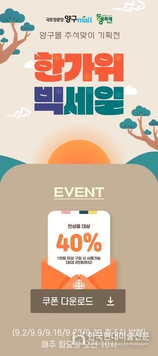 한국현대미술신문 원진 기자 | 양구 온라인 쇼핑몰 ‘양구몰’에서는 추석을 앞두고 오는 9월 30일까지 추석맞이 기획전을 진행한다.