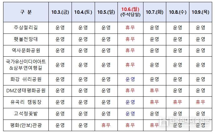 특히 대부분의 관광지는 추석 당일(10월 6일) 휴무를 갖지만, 고석정꽃밭은 추석 당일을 포함해 연휴 기간 전일 정상 운영하여 방문객들에게 쉼과 볼거리를 제공한다. 또한 DMZ 안보관광은 10월 5일~7일 휴무하며, 나머지 기간에는 정상 운영된다.
