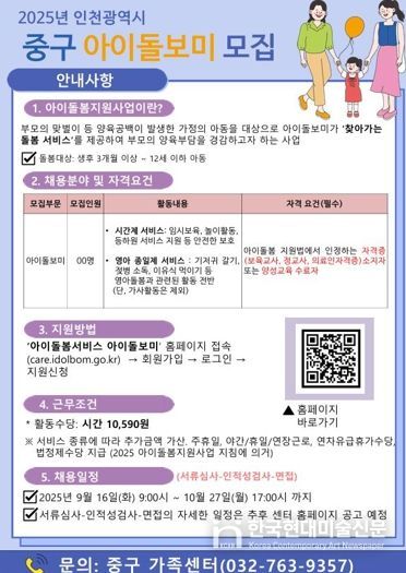 한국현대미술신문 박재남 기자 | 인천중구가족센터는 지역 내 양육 부담을 줄이고 아이의 안전한 성장을 지원하기 위해 2025년 3차 ‘아이돌보미 활동가’ 모집을 추진한다고 15일 밝혔다.