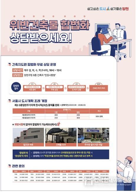 한국현대미술신문 배건 기자 | 양천구는 서울시 도시계획조례 개정으로 제2·3종 일반주거지역 용적률이 한시적으로 완화됨에 따라, 건축사가 참여하는 전문 상담센터를 운영해 위반건축물 합법화 절차를 지원한다고 16일 밝혔다.
