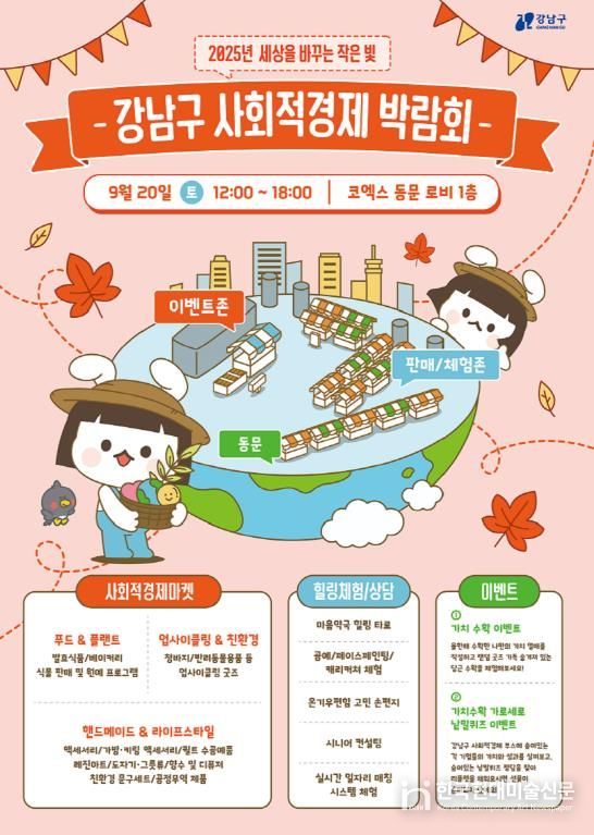 한국현대미술신문 배건 기자 | 꿈이 모이는 도시, 미래를 그리는 강남구가 오는 9월 20일 낮 12시부터 오후 6시까지 코엑스 동문 로비 1층에서 ‘2025 강남구 사회적경제박람회’를 개최한다. 올해 행사는 기존 강남역 야외무대에서 벗어나 실내 공간에서 열리며, 사회적경제기업 30여 개소가 참여한다.