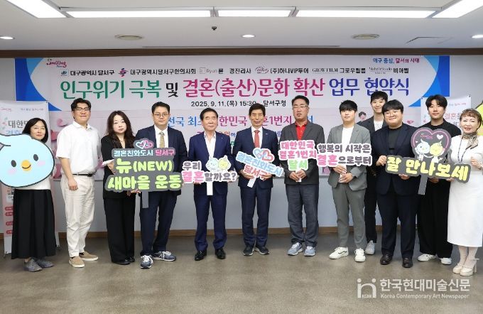한국현대미술신문 정소영 기자 | 대구 달서구는 지난 11일 구청에서 대구광역시 달서구한의사회를 비롯한 6개 민간기관·단체와 결혼친화 문화 확산과 저출생 대응을 위한 업무협약을 체결했다.