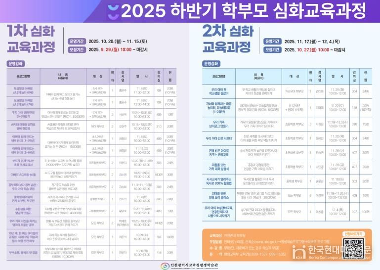 한국현대미술신문 박재남 기자 | 인천광역시교육청평생학습관은 학부모의 자녀 발달 단계별 지도 역량을 강화하고 평생학습자로서 성장을 돕기 위해 ‘2025년 하반기 학부모 심화교육과정’ 학습자를 모집한다.