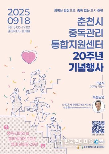 정숙자 센터장은 “이번 행사는 지난 20년의 노력을 춘천 시민과 함께 나누고, 중독 예방과 회복의 중요성을 되새기는 시간이 될 것”이라며 “앞으로도 ‘중독 없는 도시 춘천’을 실현하는 데 최선을 다하겠다”고 말했다.