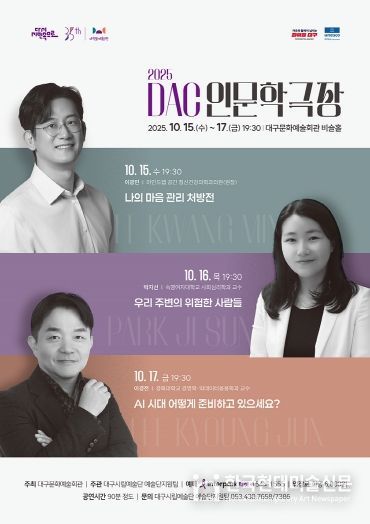 한국현대미술신문 정소영 기자 | (재)대구문화예술진흥원 문화예술회관은 인문학으로 시민들의 문화적 정서 함양과 인간다운 삶의 가치를 제공하기 위한 공개 강연인 2025 DAC 인문학극장을 오는 10월 15일부터 17일까지 오후 7시 30분 3일간 대구문화예술회관 비슬홀에서 개최한다.