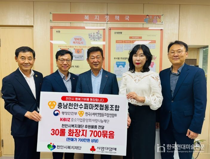 한국현대미술신문 신정은 기자 | (재)천안시복지재단은 17일 충남천안수퍼마켓협동조합이 위기가구 지원을 위해 700만 원 상당의 후원 물품을 기탁했다고 밝혔다.