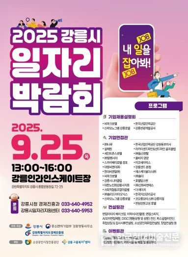 한국현대미술신문 원진 기자 | 강릉시는 중소벤처기업부 강원영동사무소, 강원특별자치도경제진흥원과 함께하는 '2025 강릉시 일자리 박람회'를 오는 9월 25일 오후 1시부터 4시까지 강릉인라인스케이트장에서 개최한다.