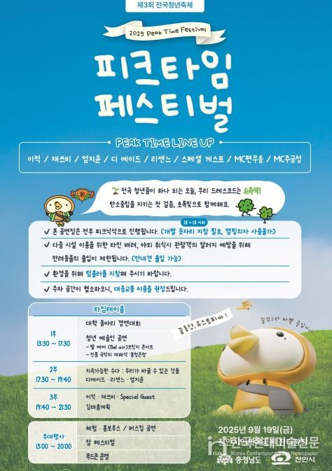 한국현대미술신문 신정은 기자 | 충남도는 오는 19일 오후 1시부터 밤 9시 30분까지 천안시민체육공원에서 제3회 전국 청년 축제 ‘2025 피크타임 페스티벌’을 개최한다.