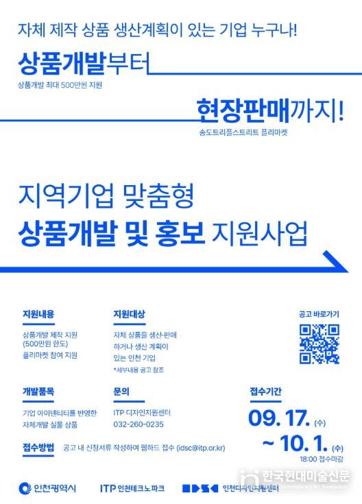 한국현대미술신문 박재남 기자 | 인천테크노파크(인천TP)는 오는 10월 1일까지 ‘2025년도 인천광역시 지역기업 맞춤형 상품개발 및 홍보 지원사업’에 참여할 중소기업을 모집한다.