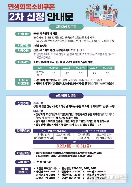 한국현대미술신문 신정은 기자 | 음성군은 이달 22일부터 2차 민생회복 소비쿠폰을 지급한다.