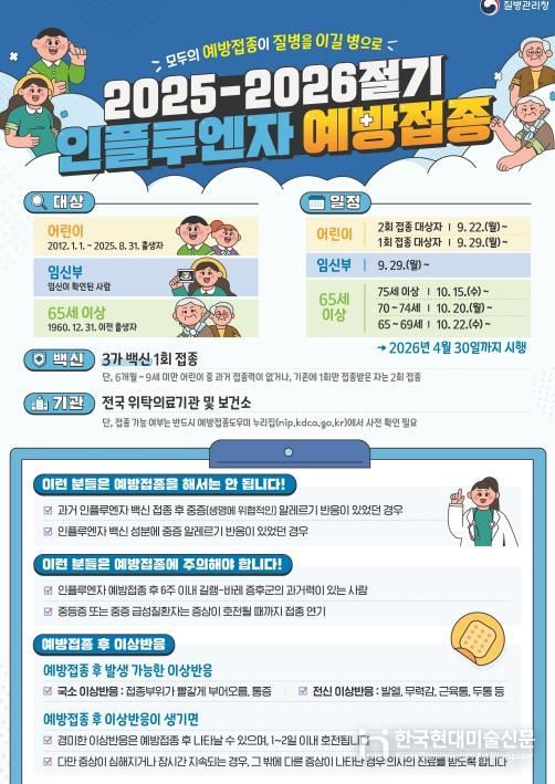 우선 22일 2회 접종 대상 어린이를 시작으로, ▲9월 29일, 어린이(1회 접종 대상)와 임신부 ▲10월 15일, 75세 이상 어르신 ▲10월 20일, 70~74세 어르신 ▲10월 22일, 65~69세 어르신의 접종이 이뤄지며, 모든 대상군 접종은 2026년 4월 30일까지 이어질 예정이다.