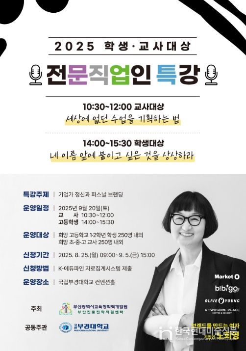 한국현대미술신문 정소영 기자 | 부산광역시교육청은 오는 20일 국립부경대학교 대연캠퍼스 컨벤션홀에서 고등학생 및 초·중·고등학교 교사 400명을 대상으로 ‘2025 학생·교사 대상 전문직업인 특강’을 개최한다.