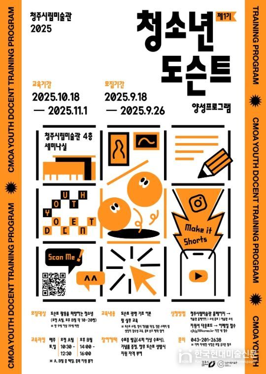 한국현대미술신문 신정은 기자 | 청주시립미술관은 18일부터 오는 9월 26일까지 ‘제1기 청소년 도슨트 양성 프로그램’ 참가자를 모집한다고 밝혔다.