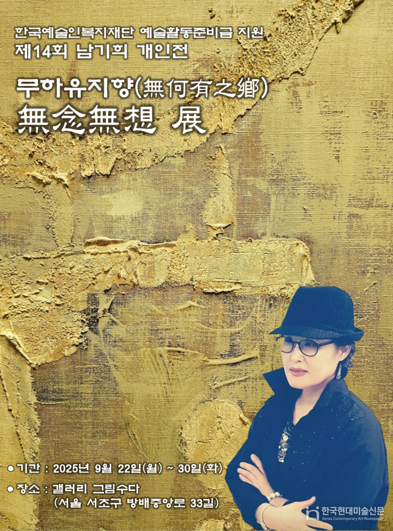 오는 9월 22일(월)부터 30일(화)까지 서울 서초구 갤러리 그림수다에서는 남기희 작가의 제14회 개인전 ‘무하유지향–무념무상’ 전이 열린다. 이번 전시는 장자의 『소요유(逍遙遊)』에 등장하는 철학적 공간인 ‘무하유지향’을 예술적 모티프로 삼아, “존재하지 않는 듯 있으나, 없음 속에 충만함이 깃든 자리”를 회화로 구현하는 실험의 장이 된다.