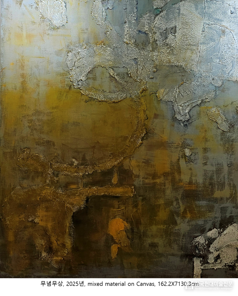 특히 이번 전시에서 주목되는 것은 독창적인 마띠에르(matière) 기법이다. 작가는 안료에 모래를 혼합해 시멘트와 같은 질감을 만들어내며, 두텁고 거친 표면 위에 시간의 흔적을 새긴다. 그 과정에서 드러났다 감춰지는 화면은 마치 과거의 자아를 벗겨내는 의식(ritual)처럼 다가온다. 이는 곧 “없으나 존재하는 것, 비었으나 충만한 것”이라는 그의 미학적 역설을 구현한다.