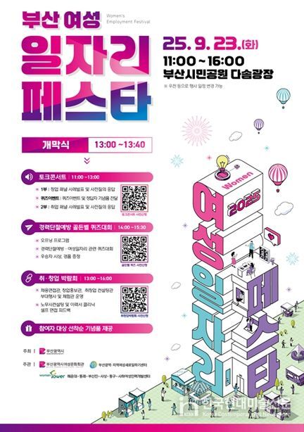 한국현대미술신문 정소영 기자 | 부산시는 오는 9월 23일 오전 11시부터 오후 4시까지 부산시민공원 다솜마당에서 '2025 부산 여성 일자리 페스타'를 개최한다고 밝혔다.