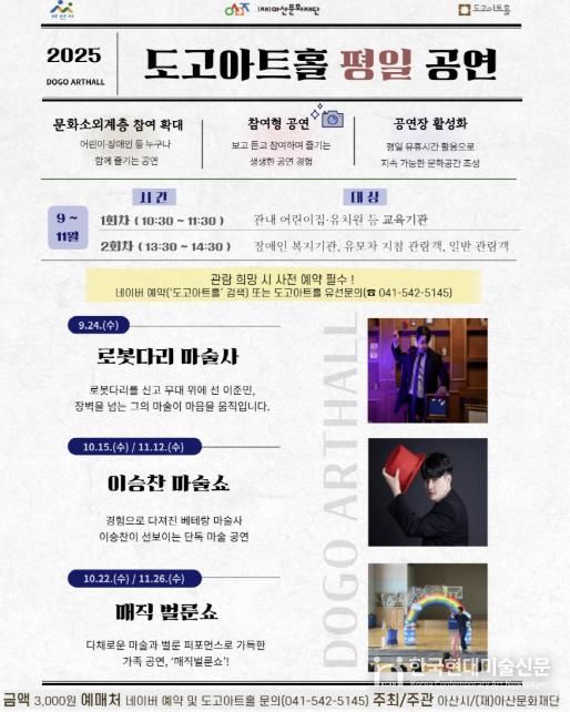 한국현대미술신문 신정은 기자 | 아산문화재단이 운영하는 도고아트홀이 2025년 9월부터 11월까지 평일 기획 공연을 진행한다. 이번 사업은 관내 어린이집·유치원 등 교육기관과 장애인 복지기관을 대상으로 기획됐으며, 지역 주민 누구나 함께 즐길 수 있는 문화 향유 기회를 제공한다.
