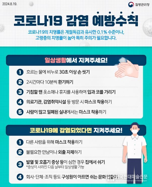 한국현대미술신문 기자 | 남원시보건소는 국내 병원급 의료기관의 코로나19 입원환자 수가 최근 10주 연속 증가하고 있으며, 9월까지 유행이 지속될 것으로 전망됨에 따라, 코로나19 확산을 최소화하고 고위험군을 보호하기 위해 코로나19 예방수칙 준수해달라고 당부했다.