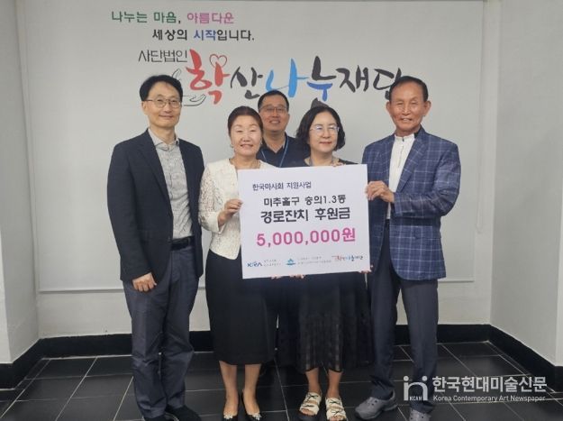 한국현대미술신문 박재남 기자 | 미추홀구 숭의1·3동 지역사회보장협의체(위원장 민명숙)는 한국마사회 인천미추홀지사(지사장 조영진)의 공모사업에 ‘숭의1·3동 경로잔치’가 선정돼 지난 18일 기부금 500만 원을 전달받았다.