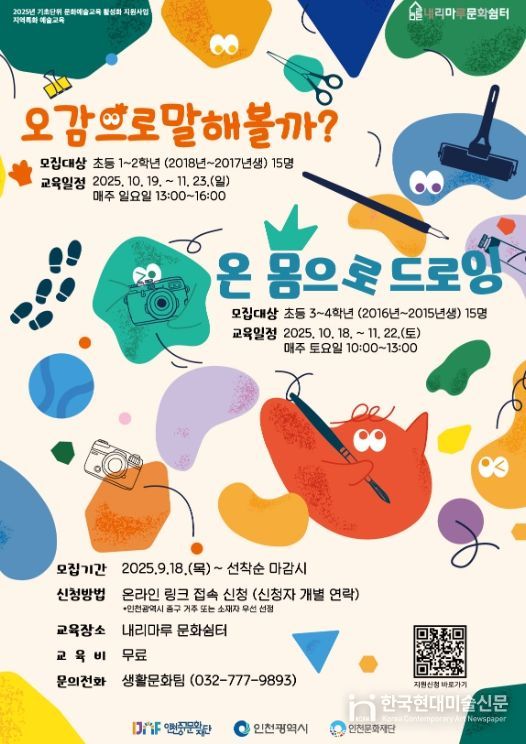 먼저 ‘온 몸으로 드로잉’은 물감 놀이, 콜라주 등 드로잉 중심의 미술 활동을 체험하는 프로그램으로, 인천시 거주 초등 3~4학년을 대상으로 10월 18일부터 11월 22일까지 매주 토요일에 총 6회에 걸쳐 운영된다.