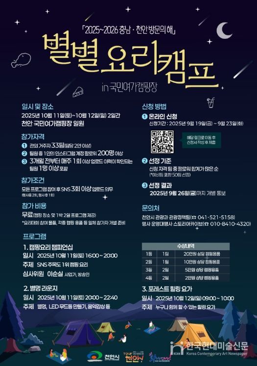 한국현대미술신문 신정은 기자 | 천안시가 체류형 관광 프로그램 ‘별별 요리 캠프 in 국민여가캠핑장’ 참가자를 모집한다고 19일 밝혔다.