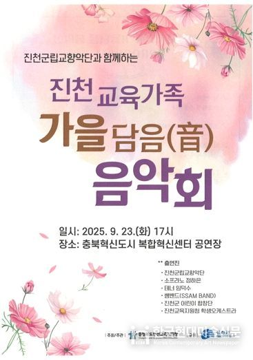 한국현대미술신문 신정은 기자 | 충청북도진천교육지원청은 오는 9월 23일 17시,충북혁신도시 복합혁신센터에서 '2025. 진천교육가족 가을담음(音) 음악회'를 개최한다.