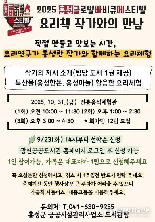 이번 행사는 2025 홍성글로벌바비큐페스티벌과 연계해 지역 특산물을 활용한 요리 체험과 작가와의 소통을 통해 독서문화 확산과 농·특산물 홍보를 함께 추진한다.