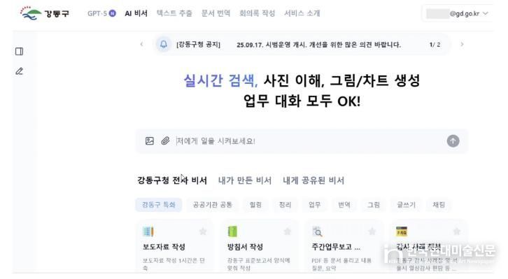 ‘생성형 AI 업무 지원 서비스’는 강동구가 최신 생성형 인공지능(AI) 모델인 GPT-5을 기반으로 다양한 실무에 적용할 수 있도록 구축한 통합 플랫폼이다.