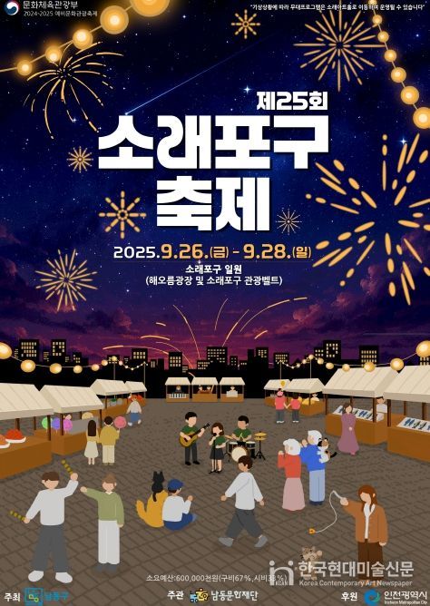한국현대미술신문 박재남 기자 | 인천시 남동구와 남동문화재단은 오는 9월 26~28일까지 사흘간 열리는 ‘제25회 소래포구 축제’의 먹거리 정보를 사전에 투명하게 공개한다고 22일 밝혔다.
