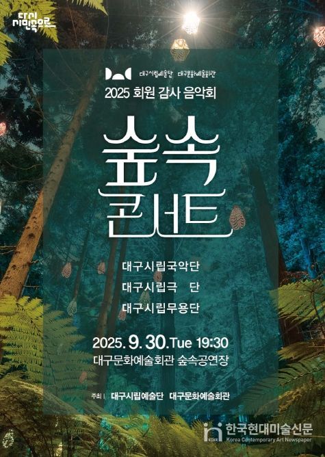 한국현대미술신문 정소영 기자 | 대구문화예술회관·대구시립예술단 2025 회원 감사 음악회 ‘숲속 콘서트’ 공연이 9월 30일 저녁 7시 30분 대구문화예술회관 숲속 공연장에서 펼쳐진다.