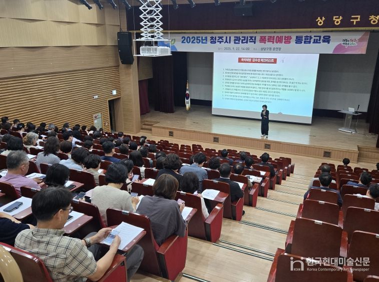 한국현대미술신문 신정은 기자 | 청주시는 22일 상당구청 대공연장에서 시 기관장과 고위직 공무원 185명을 대상으로 직장 내 4대 폭력(성희롱,성매매,성폭력,가정폭력) 예방 통합교육을 실시했다.
