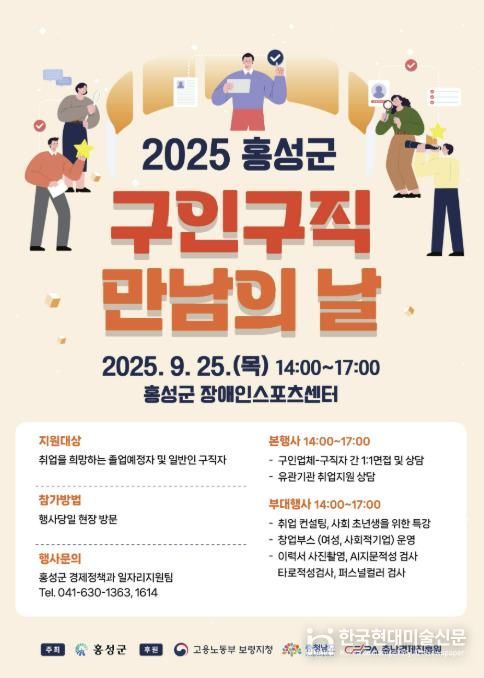 한국현대미술신문 신정은 기자 | 홍성군은 오는 25일 오후 2시 장애인스포츠센터에서 ‘구인·구직 만남의 날’을 열고 구직자에게 취업 기회를, 구인기업에는 우수 인재 채용의 장을 제공한다고 밝혔다.