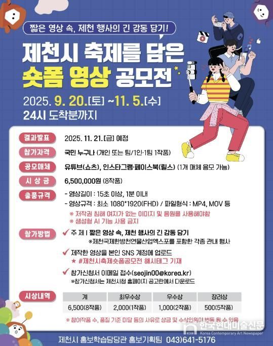 한국현대미술신문 신정은 기자 | 제천시가 오는 11월 21일까지 '제천시 축제를 담은 숏폼 영상 공모전'을 개최한다.
