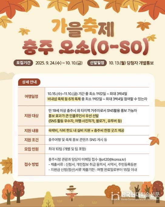 한국현대미술신문 신정은 기자 | 충주시는 가을을 맞아 지역 곳곳에서 펼쳐지는 축제 기간 동안 충주에 머물며 특별한 여행을 즐길 수 있는 체류형 관광 프로그램 ‘가을축제 오소(O-SO) 충주’ 참가자를 9월 24일부터 10월 10일까지 모집한다.