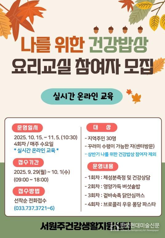 한국현대미술신문 원진 기자 | 서원주건강생활지원센터는 지역 주민의 올바른 식습관 형성과 대사증후군 예방·관리를 돕기 위해 ‘나를 위한 건강밥상 요리교실’ 프로그램 참여자를 모집한다.