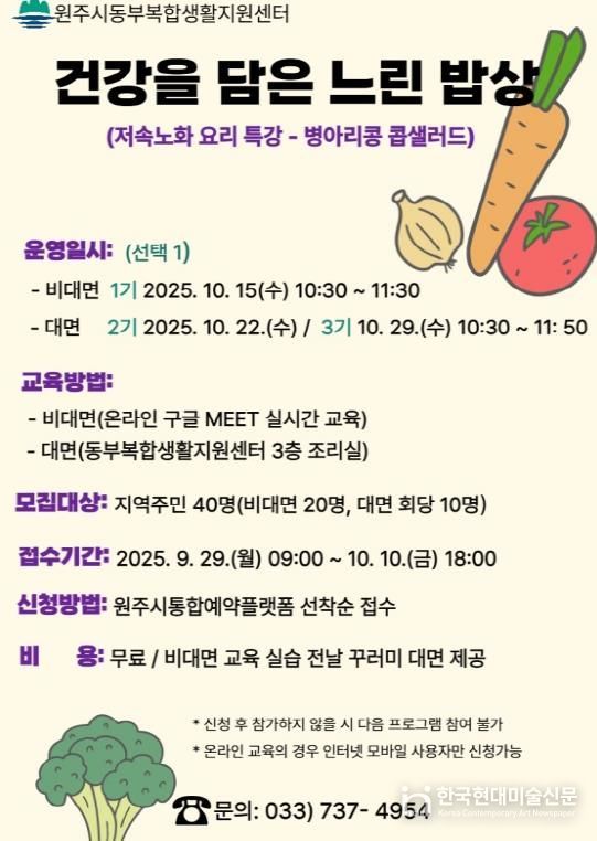 한국현대미술신문 원진 기자 | 원주시동부복합생활지원센터는 오는 29일부터 저속노화 요리 특강 ‘건강을 담은 느린 밥상’ 프로그램 참여자를 모집한다.