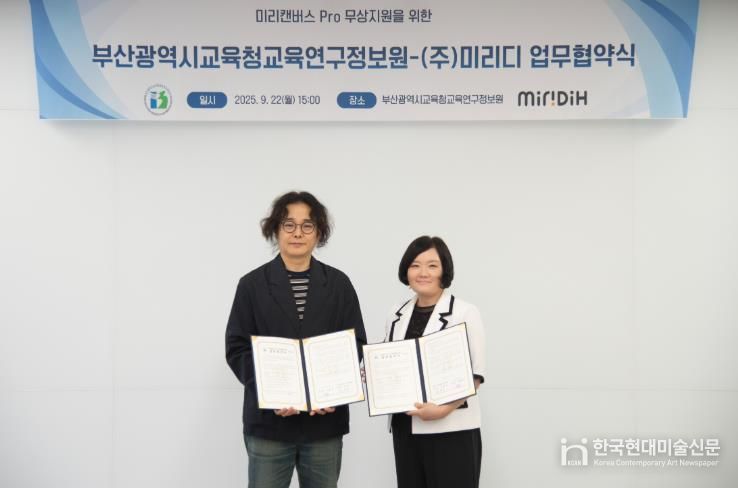 한국현대미술신문 정소영 기자 | 부산광역시교육청교육연구정보원은 지난 22일 오후 교육연구정보원 회의실에서 (주)미리디(대표 강창석)와 업무협약을 체결했다고 밝혔다.