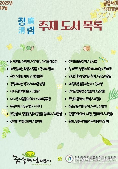 한국현대미술신문 박재남 기자 | 인천광역시교육청 신트리도서관은 10월 1일부터 31일까지 부평구 작은도서관 ‘춤추는달팽이도서관’과 함께 청렴을 주제로 공유서가를 운영한다.
