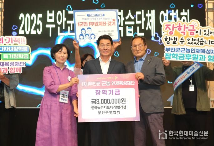 한국현대미술신문 기자 | 지난 22일, 부안군 스포츠파크 실내체육관에서 열린 ‘2025 부안군 농업인 학습단체(농촌지도자·생활개선회) 연찬회’에서 부안군 지역인재를 키우는 장학금 기부 릴레이가 이어졌다.