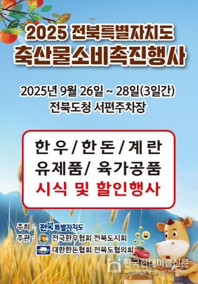 한국현대미술신문 기자 | 전북특별자치도가 추석 명절을 맞아 도민들에게 안전하고 품질 좋은 축산물을 저렴하게 제공하기 위해 ‘2025년 축산물 소비촉진행사’를 연다. 도는 이번 행사를 9월 26일부터 28일까지 사흘간 도청 서편광장에서 개최한다고 23일 밝혔다.