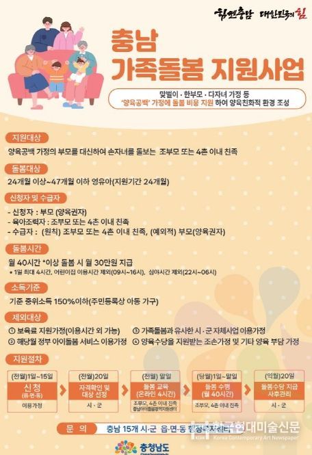 한국현대미술신문 신정은 기자 | 충남도가 영유아 가족 돌봄을 사회적 가치가 있는 노동으로 인정하고 가족구성원의 삶의 질을 높이며, 양육 친화적인 환경을 조성하기 위한 제도를 본격적으로 시행한다.