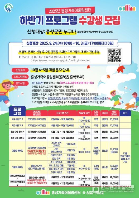 한국현대미술신문 신정은 기자 | 홍성군은 9월 24일부터 10월 3일까지 홍성가족어울림센터 ‘2025년 하반기 프로그램 수강생’을 모집한다고 밝혔다.