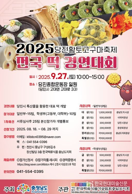 한국현대미술신문 신정은 기자 | 당진시는 오는 27일 오전 10시 50분부터 오후 3시까지 당진종합운동장 일원에서 ‘2025년 전국 떡 경연대회’를 개최한다고 24일 밝혔다.