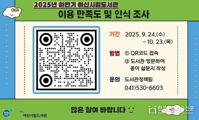설문은 △도서관 서비스별 만족도 △도서관의 사회적 영향 인식 등 총 5항목으로 구성되며, 온라인(QR코드 접속)과 오프라인(아산시립도서관 7개관 내 비치된 종이 설문지 제출)으로 참여할 수 있다.