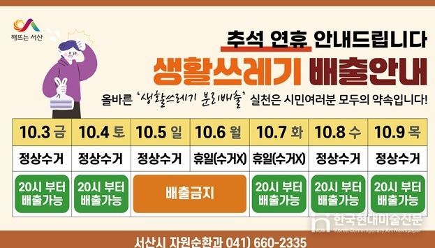한국현대미술신문 신정은 기자 | 충남 서산시는 추석 명절을 맞아 귀성객과 시민들이 쾌적하게 명절을 보낼 수 있도록 “추석 명절 쓰레기 관리 대책”을 10월 10일까지 추진한다고 밝혔다.