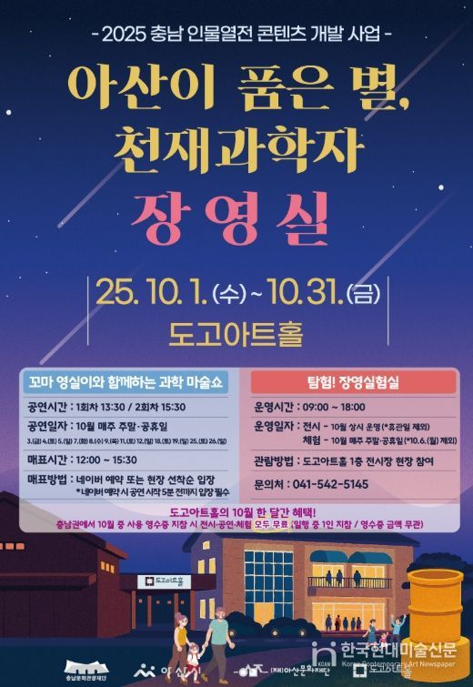 한국현대미술신문 신정은 기자 | 아산문화재단이 운영하는 도고아트홀은 오는 10월 1일부터 31일까지 아산의 대표 역사 인물 장영실을 주제로 한 공연 및 전시·체험 프로그램을 선보인다.